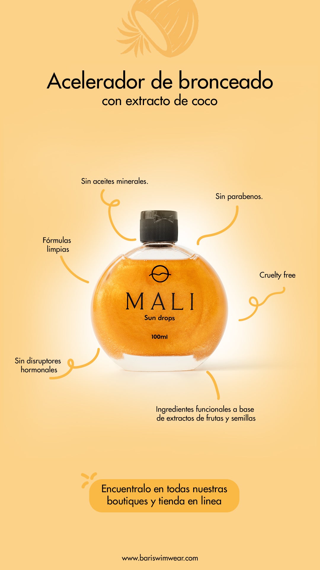 Sun Drops es un acelerador de bronceado natural con extracto de coco que estimula la producción de melanina para lograr un bronceado más rápido, uniforme y duradero. Su fórmula limpia combina aceites de sandía, coco, uva, almendra y oliva, enriquecidos con vitamina E para nutrir e hidratar la piel mientras te expones al sol.