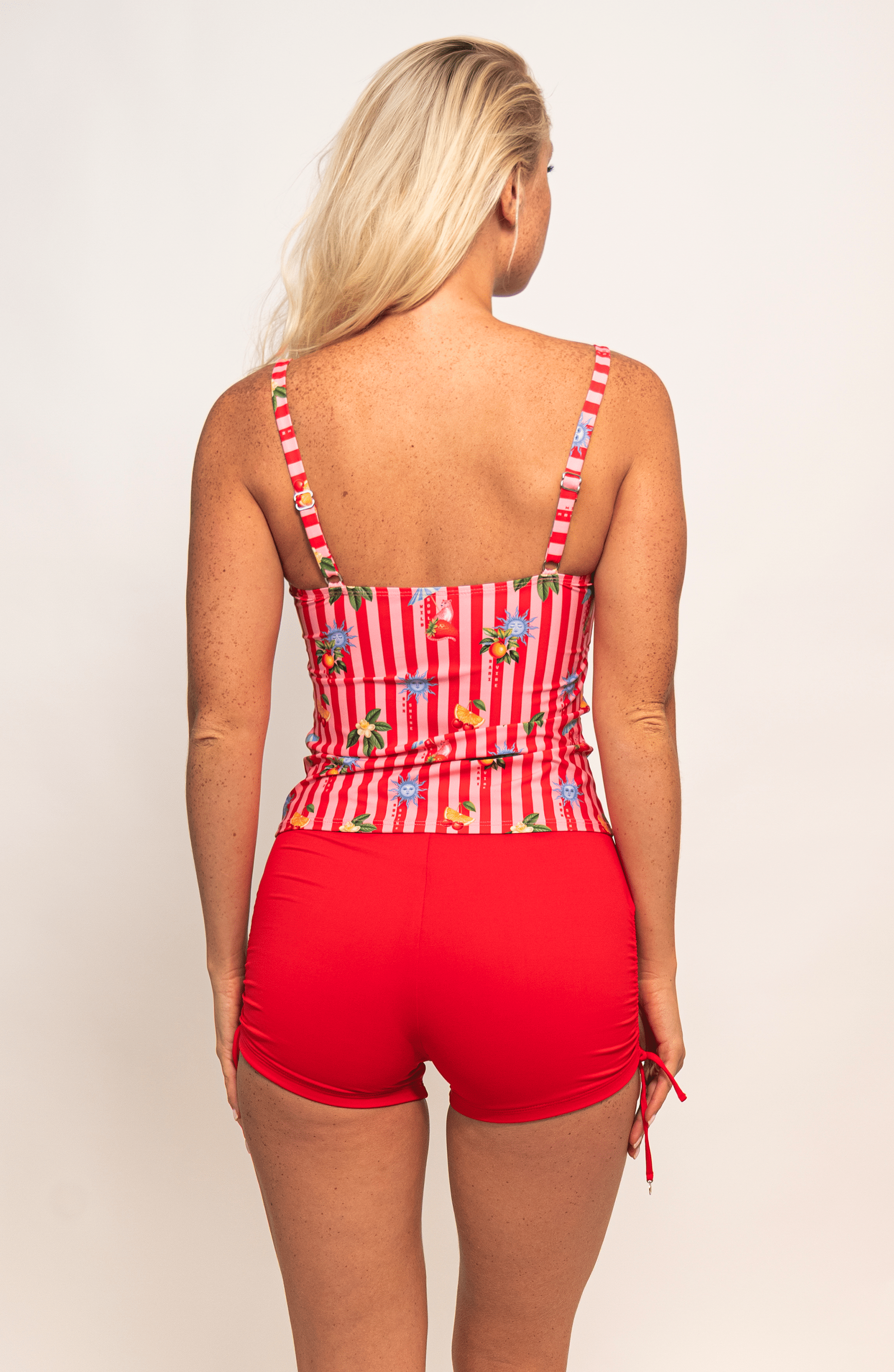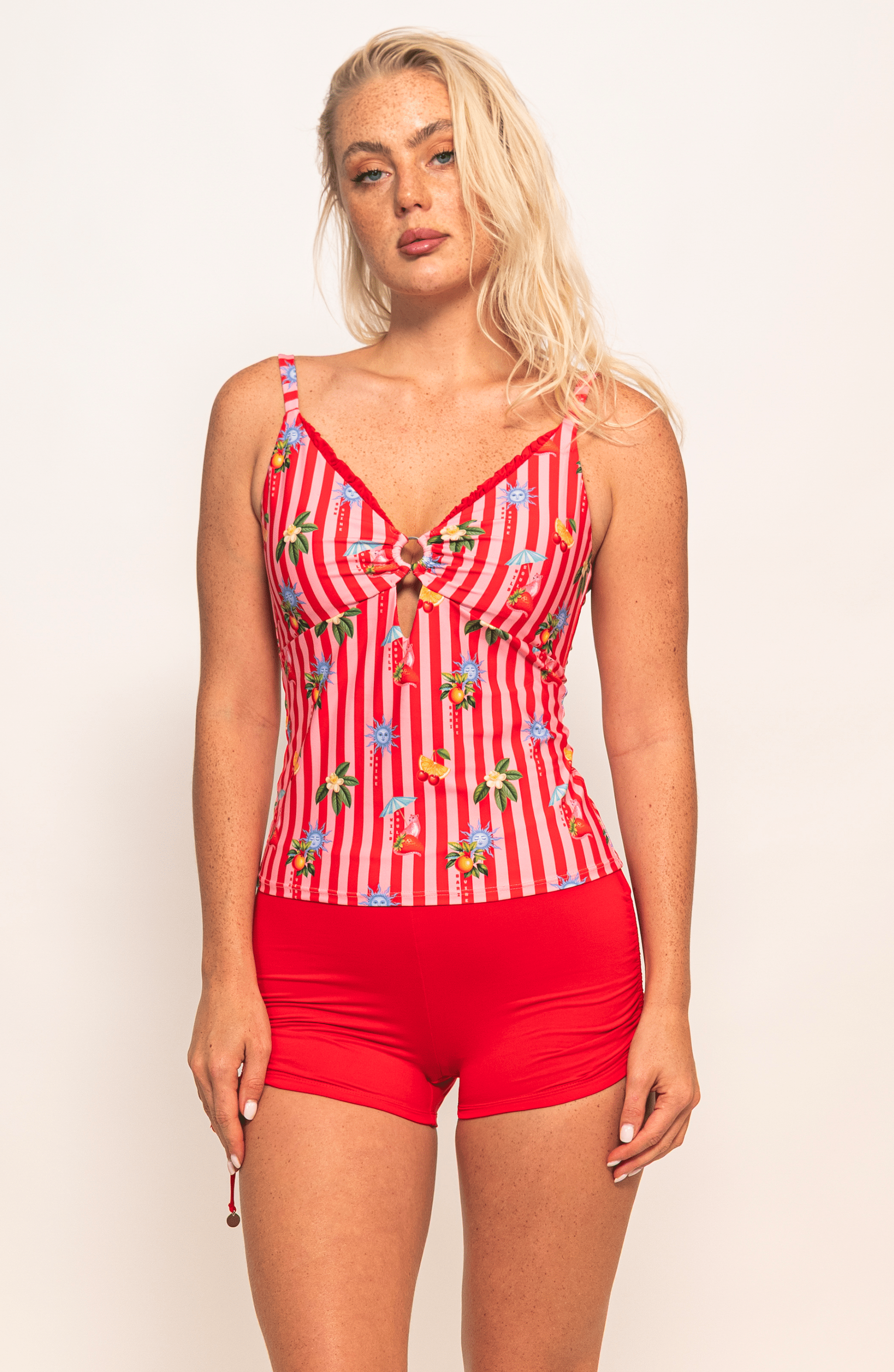 Este tankini de Bari Swimwear con short es la combinación perfecta entre comodidad, soporte y estilo. El top cuenta con copa removible y varilla lateral, ofreciendo una sujeción favorecedora que realza el busto de forma natural. Su copa plisada con argolla y el plisado central en las copas aportan textura y un detalle sofisticado que estiliza la parte superior.