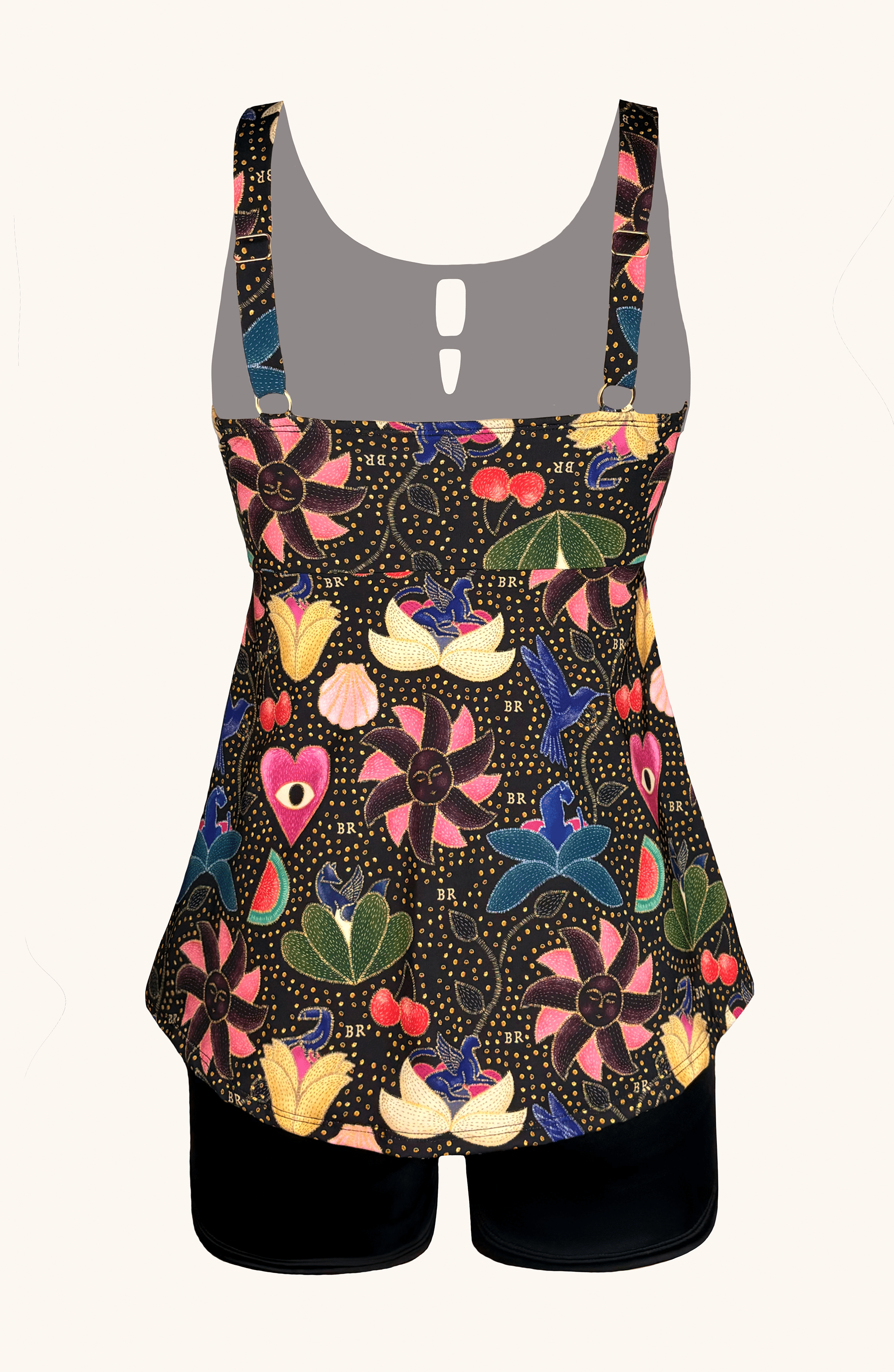 Este tankini  estampado con copa removible y varillas laterales que aportan comodidad durante todo el día. La panty tipo short brinda mayor cobertura y libertad de movimiento, ideal para quienes buscan un traje de baño cómodo, funcional y con estilo. Con un certificado Oeko-Tex para seguridad en el contacto con la piel,  Además, ofrece protección solar UPF 50+ para cuidar tu piel de los rayos UV y tela eco amigable.
