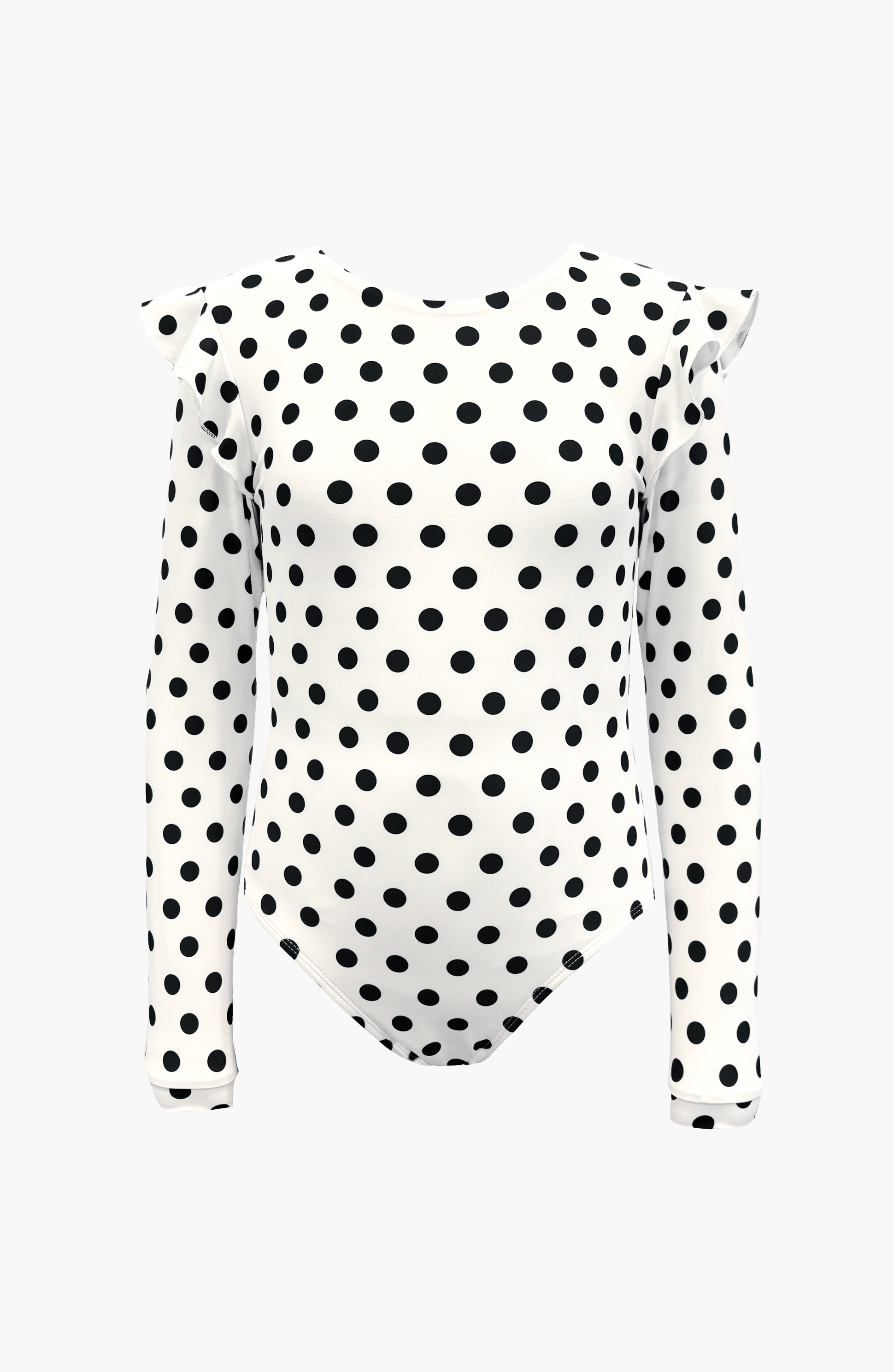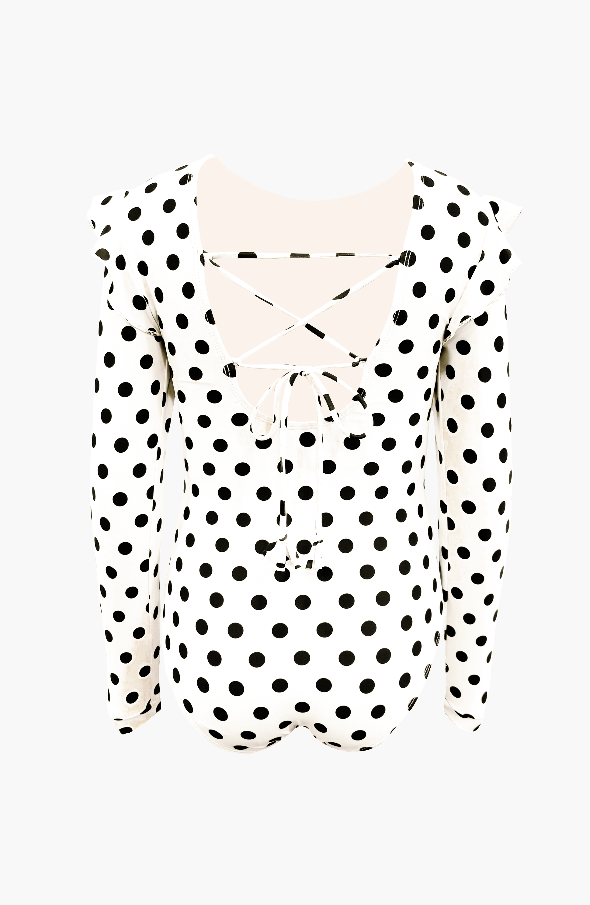 Traje completo para niña con estampado lunares de la colección Limoncello con copas removibles y protección solar. Ideal para hacer match mamá e hija.