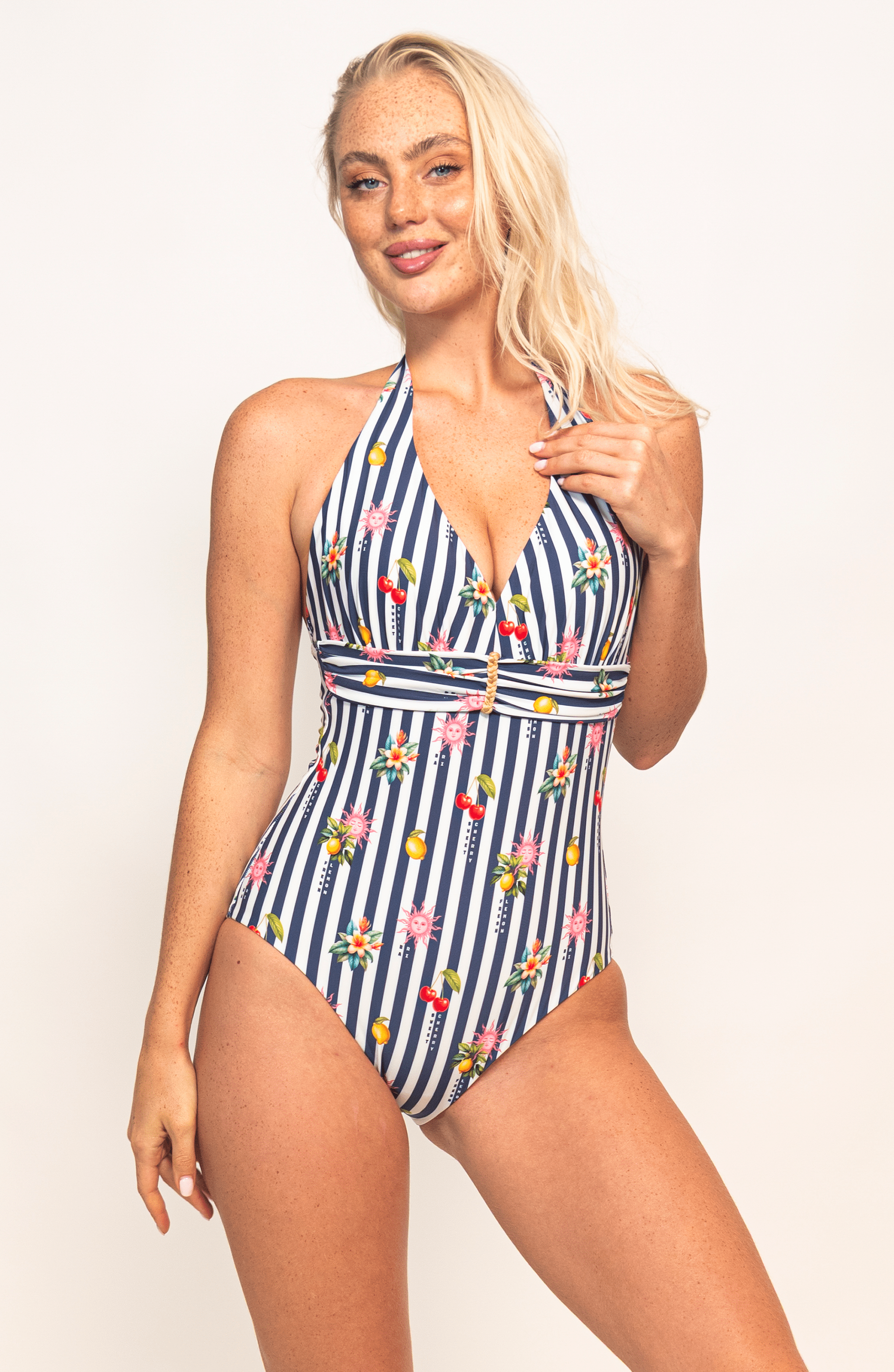 Traje de Baño Completo Rayas Control Abdominal Halter, Colección Alma Frutal