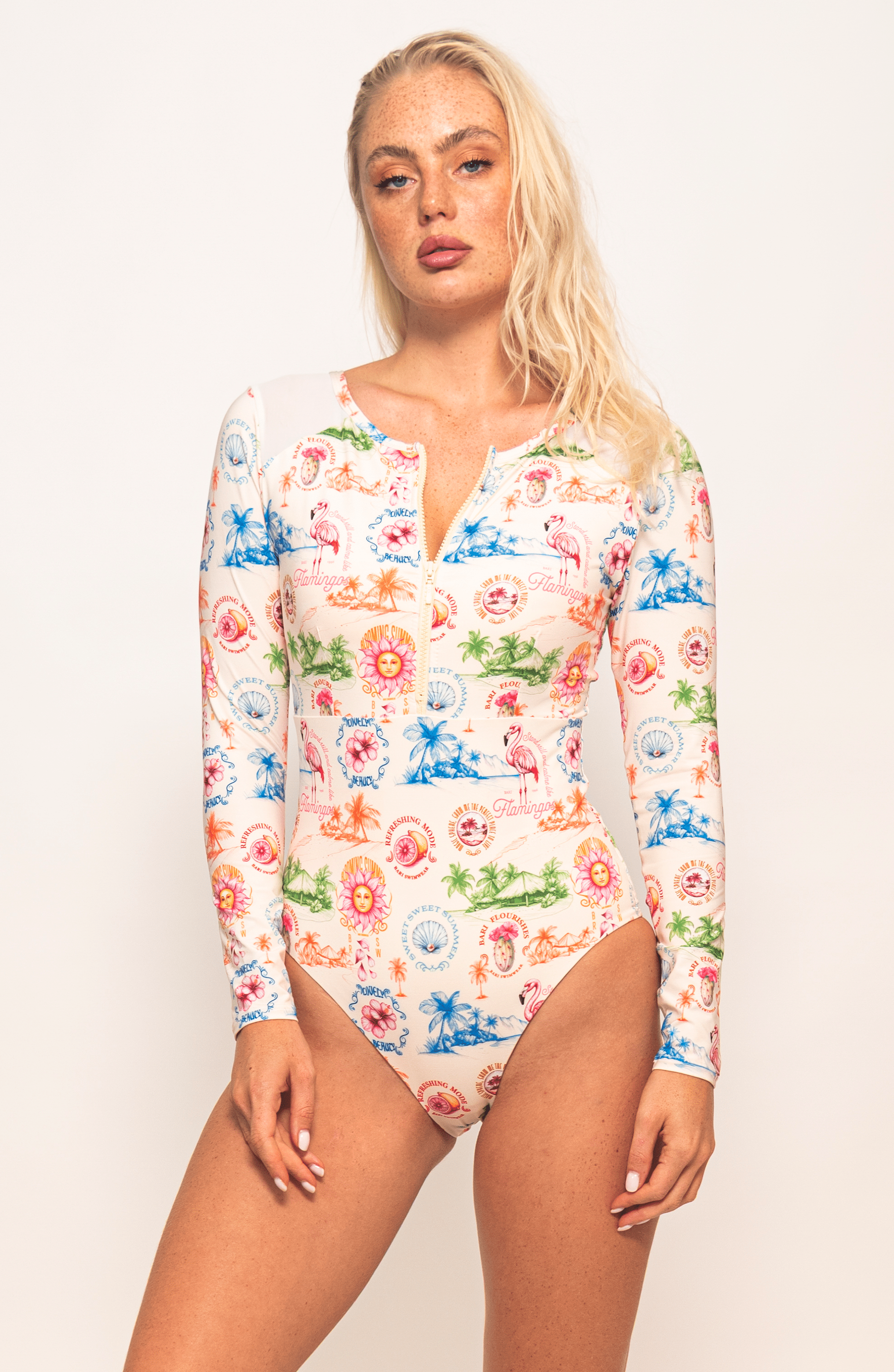Traje de baño completo de Bari Swimwear con manga larga y diseño elegante. Incluye copa removible para mayor comodidad y es sin varilla, ideal para un fit natural. Su escote profundo en la espalda con amarre aporta un toque sofisticado y permite un ajuste personalizado.